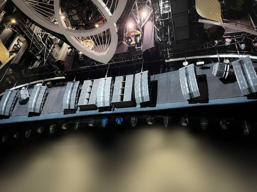 The L-ISA Scene system consists of 102 L-Acoustics K3, including nine hangs stretched across and extending beyond the stage, with six further surround hangs of L-Acoustics K3 placed at the side of the venue. Two X12 are placed below the K3 Extension system for extension near-fill. Two arrays, each consisting of 1 A15 Focus and 1 A15 Wide, provide fill for the audience areas located to the far left and right of the stage. The spatial distribution of sound is handled by an L-ISA Processor II with a 64-output license.