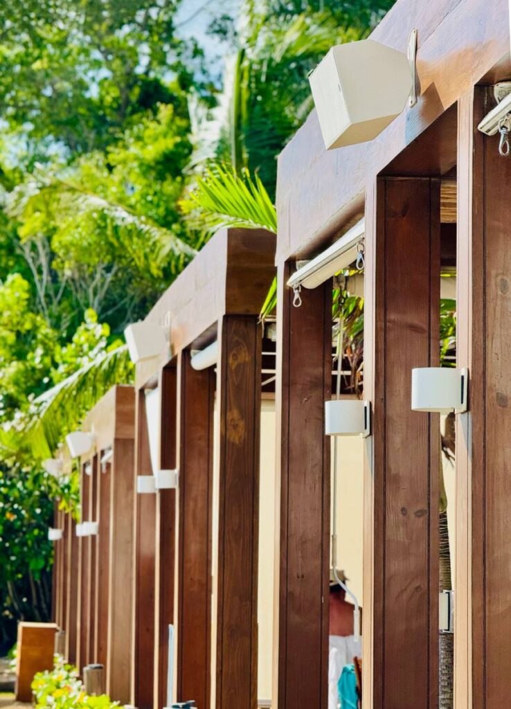 Each cabana has an independent wall controller so guests can adjust volume within their own space, along with a Bluetooth receiver for personal playback. “Even though the cabanas are close together, when it’s quiet in the evening you can connect your own music and it works beautifully,” Delvillar says.